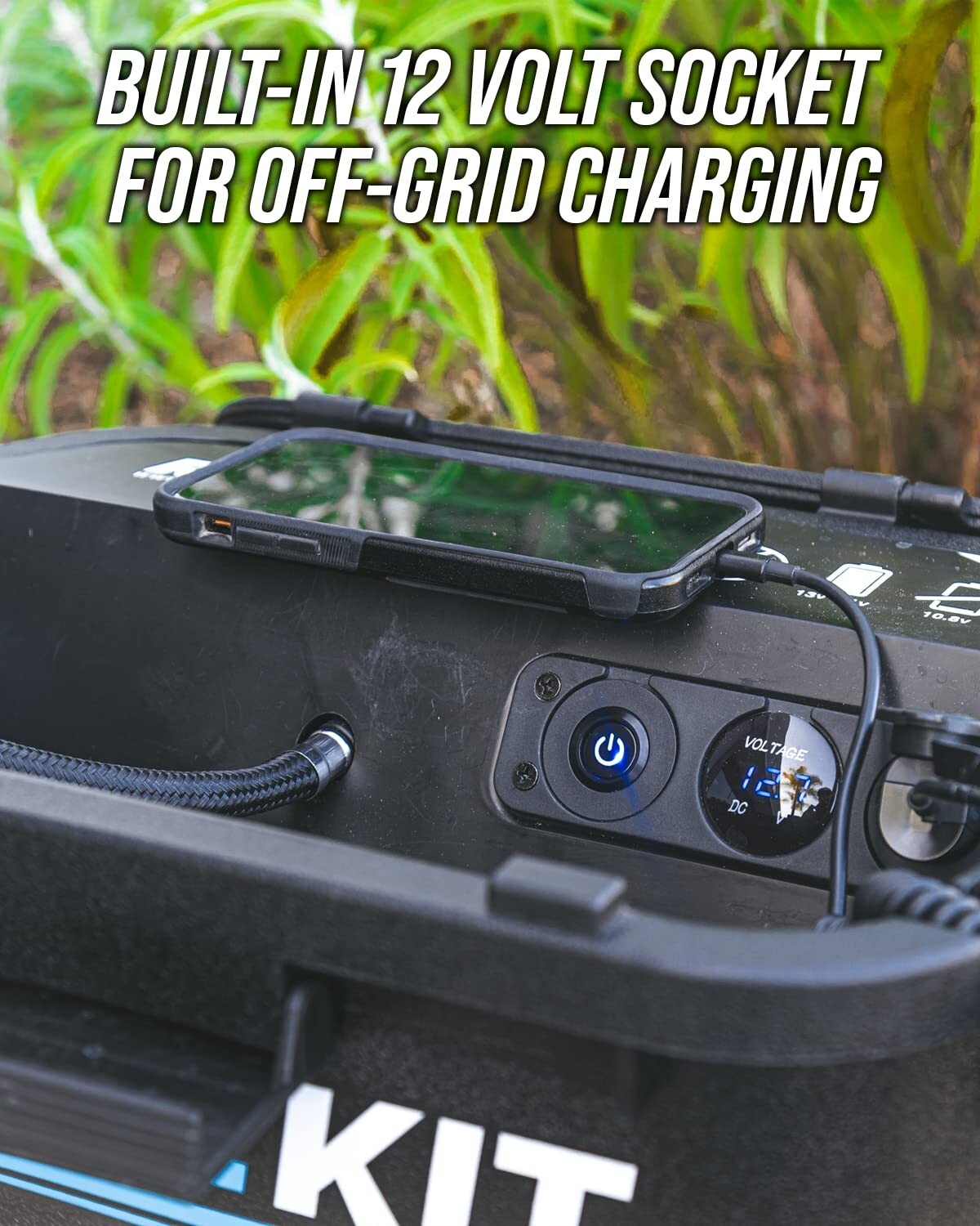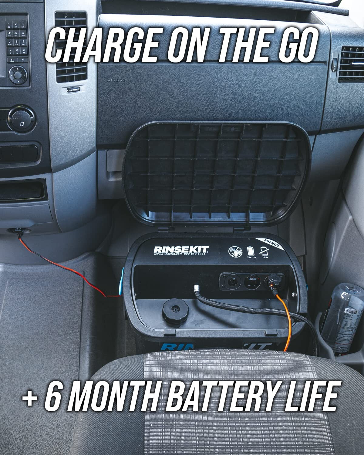 - Long-lasting, Powerful Battery: Comes fully charged with 6 months worth of battery life, so your shower stays powerful for longer. Car and wall charger are included. Built-in 12 volt socket allows the internal battery to charge external devices - perfect for charging phones, cameras, lights and more.