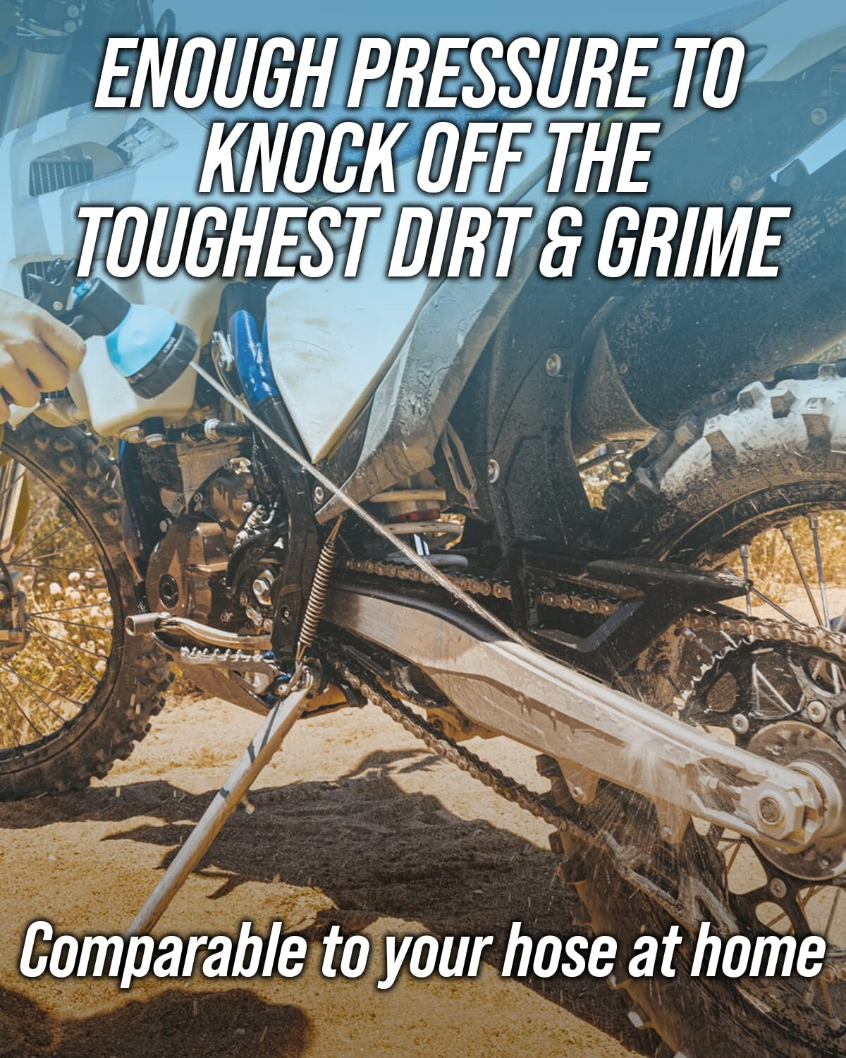 - Extremely Powerful Pressure: Unique battery powered pressurization system allows for maximum pressure at 50 PSI consistently. The PRO is able to knock off dry dirt and grime with the same power as your water hose or shower at home. A much stronger spray than foot pump or gravity fed showers.