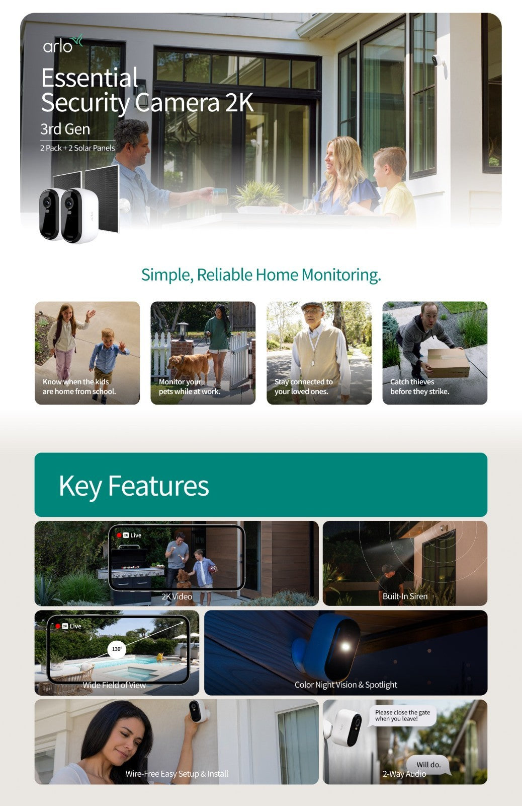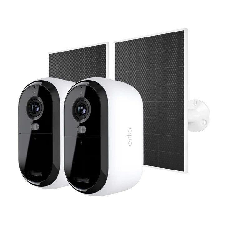 Arlo Essential 2K Camera plus 2 Solar Panel chargers, 2-pack AI-powered Camera