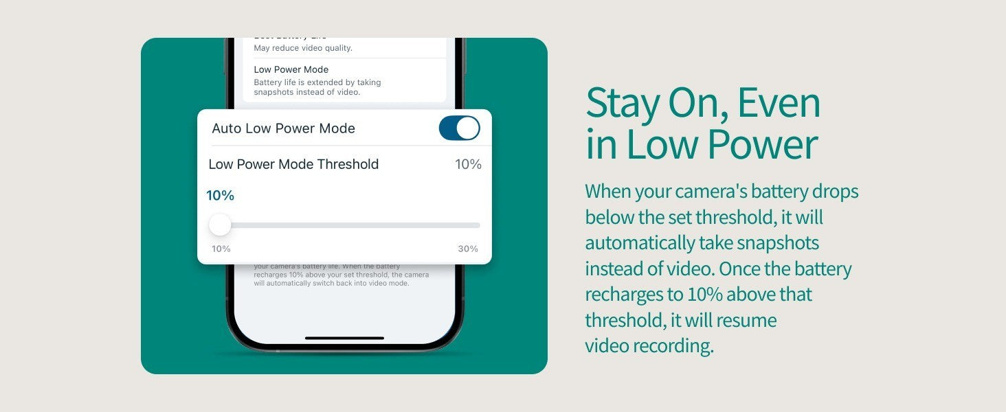 - When motion is detected, your camera will automatically switch from video to snapshots when power reaches your selected threshold to extend battery life with Low Power Mode.