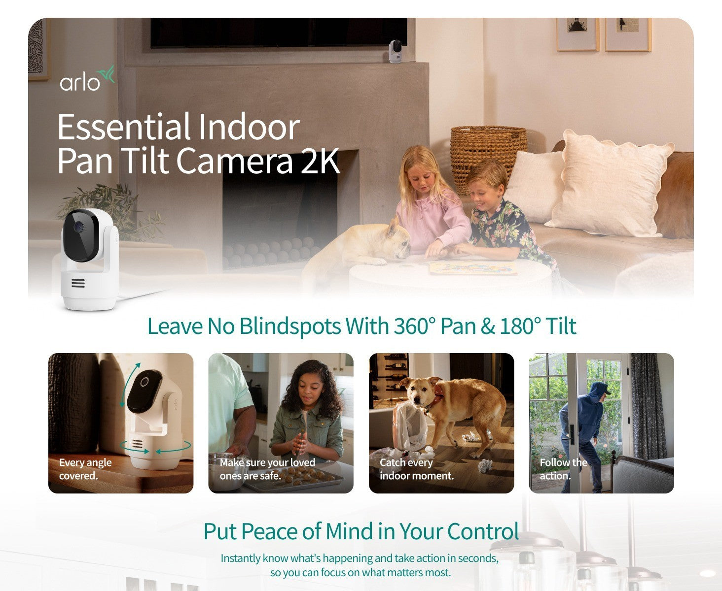 Protect inside your home and loved ones with AI-powered Arlo Intelligence that identifies potential security threats and sends alerts to your smartphone. See what’s happening with crystal-clear 2K video and read AI-generated descriptions of what’s in each video clip. Plus, with pan and tilt viewing, you’ll have every angle covered.