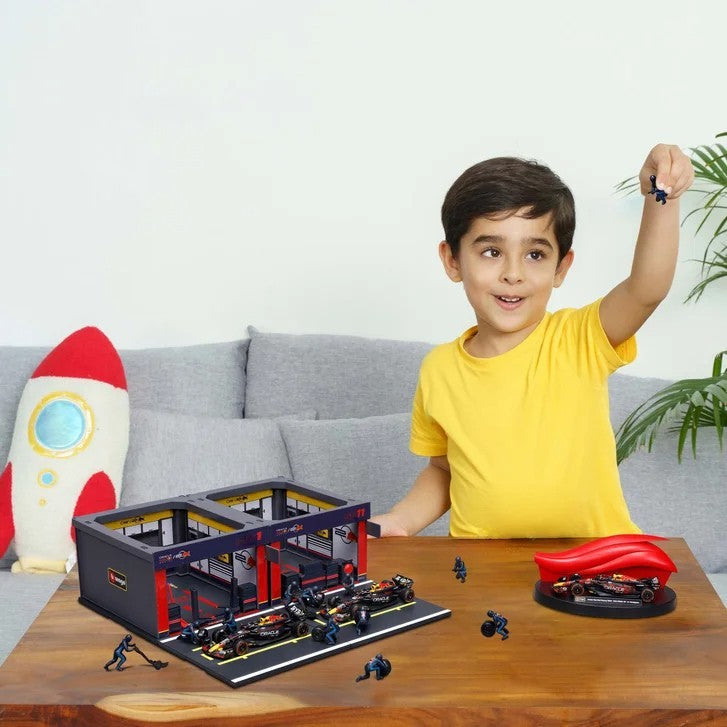 Ferrari / Red Bull / Mercedes AMG / McLarenSpeed, style, and sleek design — this set includes three racing cars in detailed 1:43 scale that roll smoothly into action. The race doesn’t happen without the team! Gear up with 12 pit crew members, ready to refuel, make quick fixes, and keep your cars track-ready. Set up your racing HQ with two detailed pit garages, the perfect home base for your cars and crew.Includes: