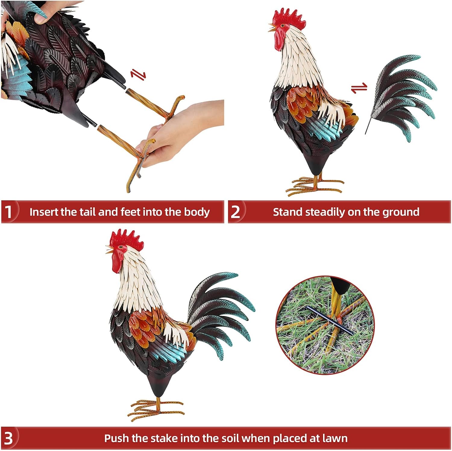 EASY TO ASSEMBLE: The rooster outdoor decor stands at 6.3"x13.8"x18.9".The Legs of the chicken sculpture knock-down for shipping, no tools required for assembly
