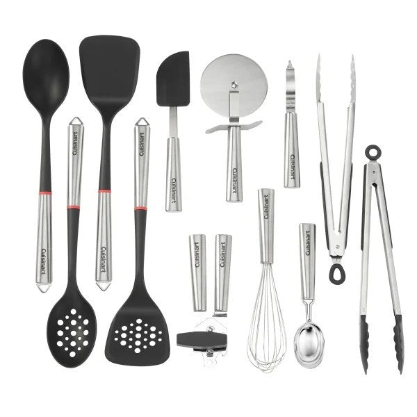 This kitchen tool and gadget collection features stainless-steel handles that contrast with black nylon heads, while the red ring in the middle of each tool adds a dash of color. These dishwasher-safe utensils and gadgets cover nearly every prepping, cooking, and serving task. The set includes one of each: whisk, peeler, can opener, pizza cutter, solid spoon, slotted spoon, solid turner, slotted turner, silicone spatula, ice cream scoop, 12” nylon tongs, and 12” stainless-steel tongs.