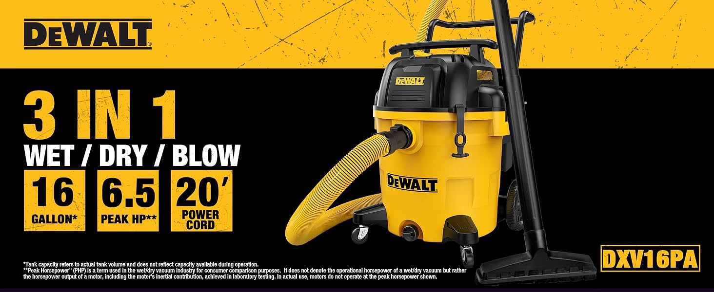 The Dewalt 16 Gallon* 6.5 HP** Stealthsonic Quiet Wet/Dry Vacuum has a convenient handle and large rear wheels for easy maneuverability around the jobsite, even when the tank is full. Quiet technology delivers less than 65dBA noise, for a low noise working environment. It features a fine-dust cartridge filter for small, dry debris and wet materials. With a large, water-resistant on/off switch, built-in 20 ft. power cord, and accessory bag to keep tools and attachments organized, this tough vacuum is built for the jobsite. Move it in any direction with the swiveling casters, and empty liquids easily with the built-in tank drain. *Tank capacity refers to actual tank volume and does not reflect capacity available during operation. **Peak Horsepower" (PHP) is a term used in the wet/dry vacuum industry for consumer comparison purposes. It does not denote the operational horsepower of a wet/dry vacuum but rather the horsepower output of a motor, including the motor's inertial contribution, achieved in laboratory testing. In actual use, motors do not operate at the peak horsepower shown. Features: