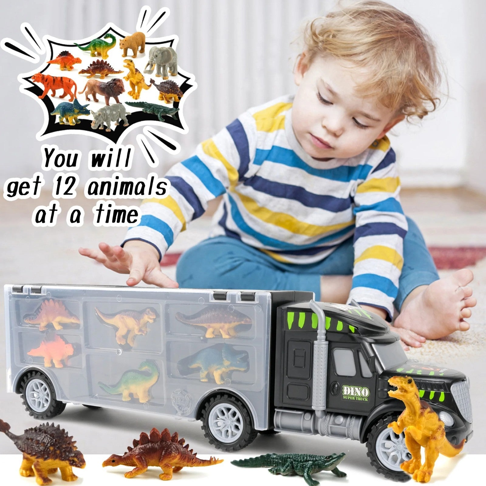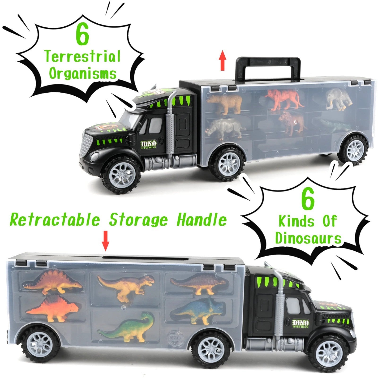 - Dinosaur Truck Set: Dinosaur truck toy comes with a dinosaur truck carrier, 6 mini dinosaurs toys, and 6 mini wild animals toys.