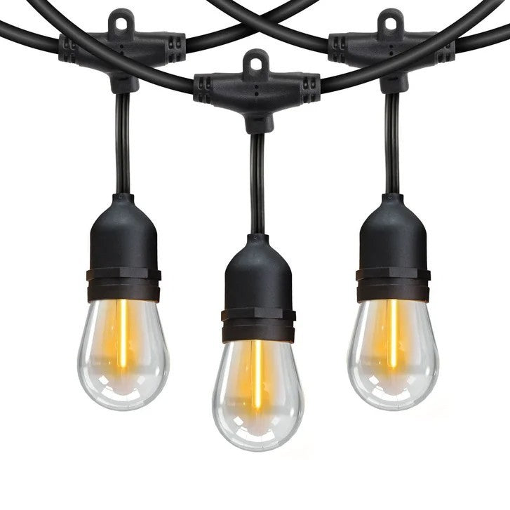 Add charm and energy efficiency to any space with Feit Electric LED string lights. Designed for outdoor use, these lights are approved for durability in all weather conditions. Each 48-foot strand features a black cord with 24 sockets spaced 2 feet apart, plus 24 shatter-resistant LED filament bulbs (including 2 extras). The weatherproof sockets create a tight seal around bulb bases to help protect against moisture. A redesigned T-Connector makes installation easy—suspend from hooks, screws, or a guide wire. Connect to 30 sets. Sockets hang approximately 4 inches from the cord. Perfect for patios, porches, walkways, restaurants, and any space where warm, decorative lighting is desired.