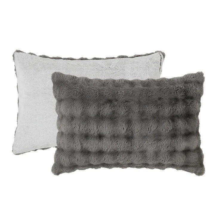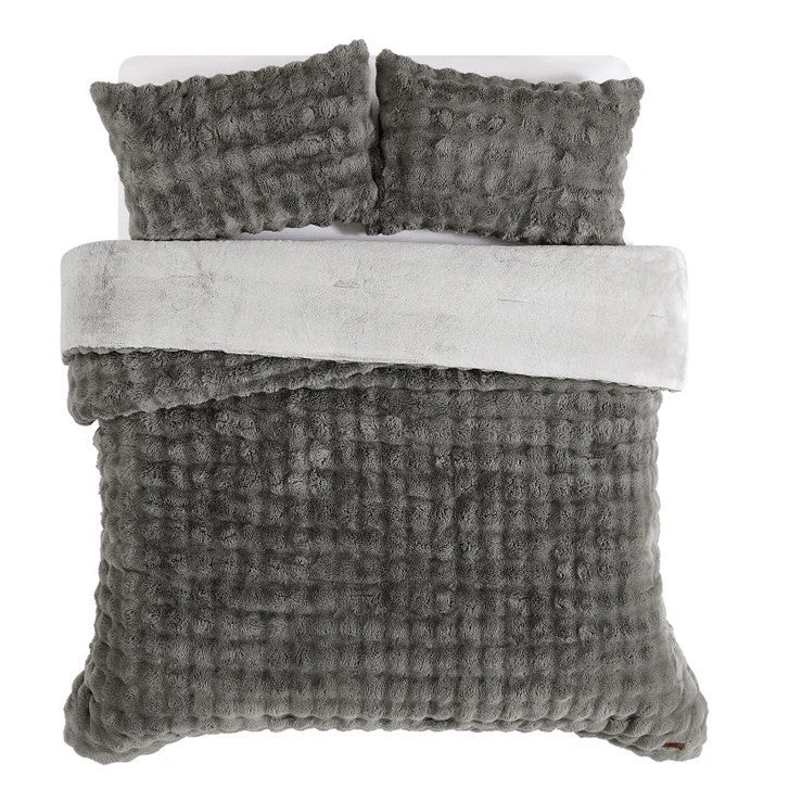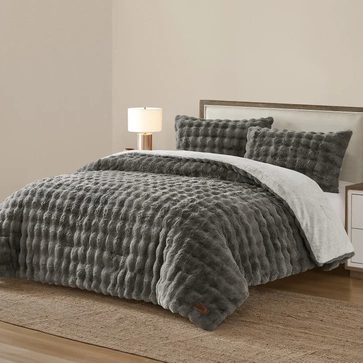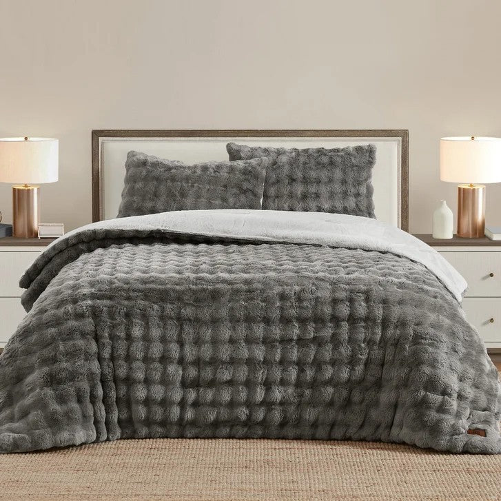 This FRYE brand Faux Fur 3-piece Comforter Set is reversible Faux Rabbit Fur with a soft carving and silky hand. The set includes 1 oversized comforter and 2 shams. The gray and beige colors will easily coordinate with any room, and will add warmth and style to any décor.