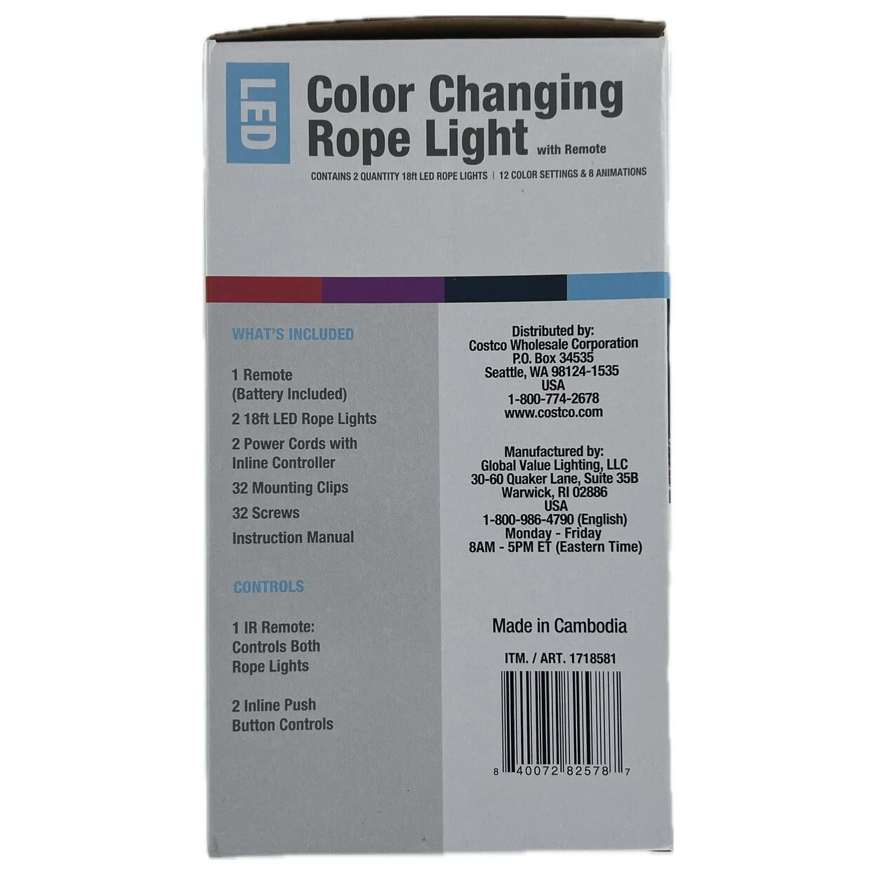 Global Value Lighting 18ft LED Color Changing Rope Light with Remote, 2-pack