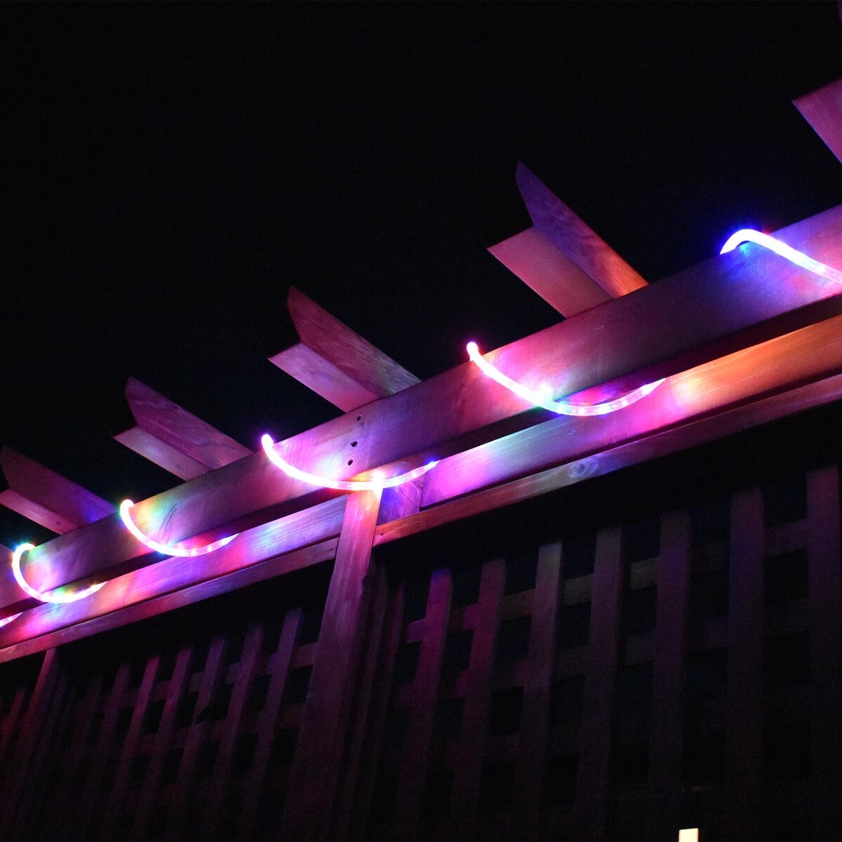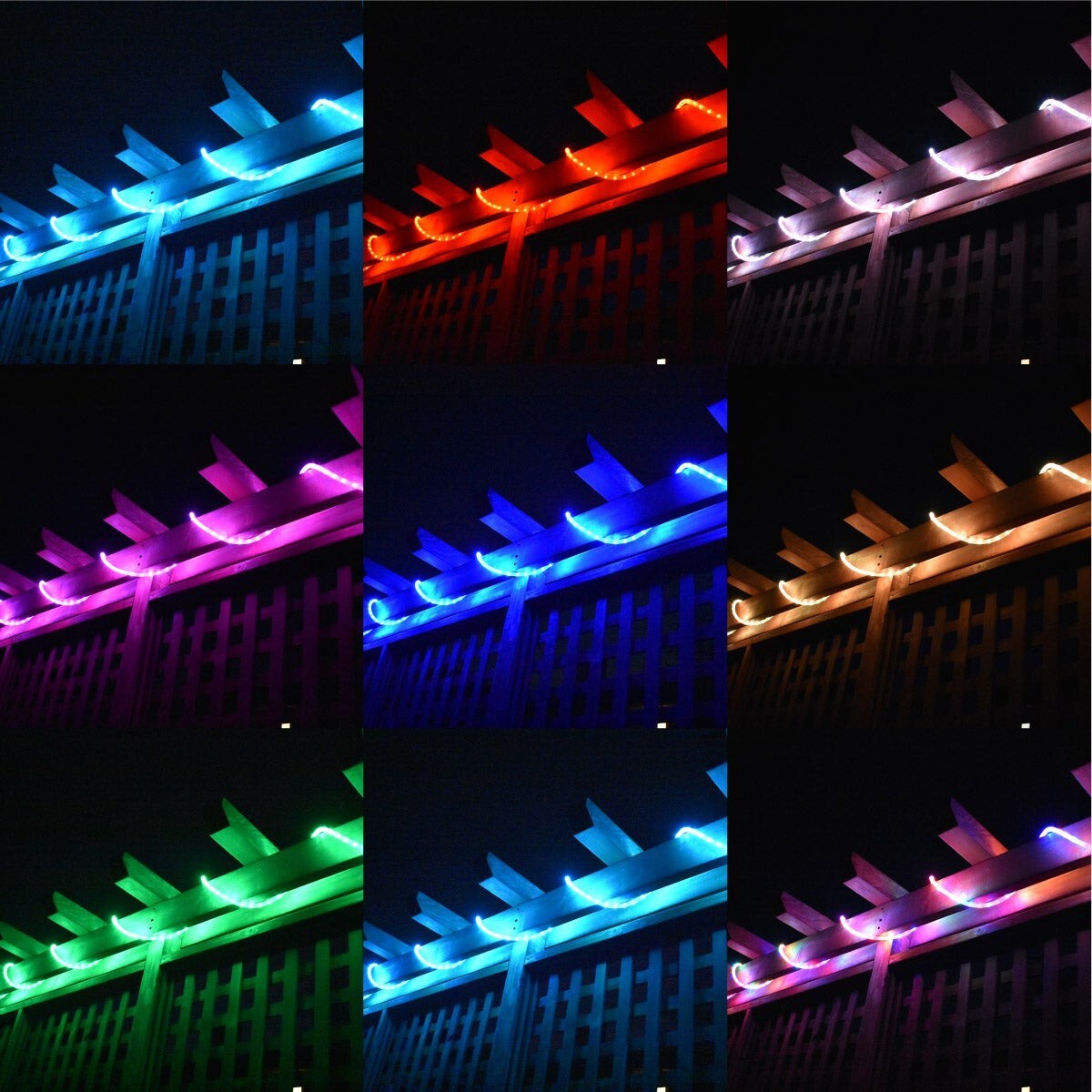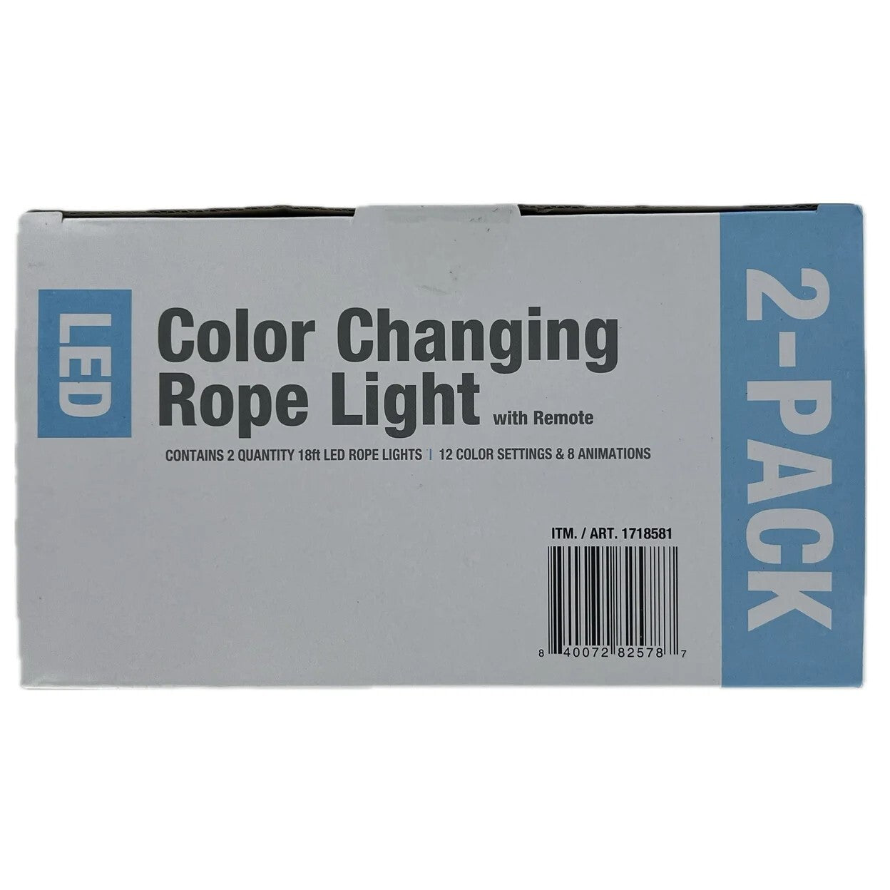 Decorate any space with a 2-pack of the flexible 18ft LED Color Changing Rope Light. The Rope Light is outdoor rated and can be used in both indoor and outdoor applications. The remote control allows you to select from up to 12 color settings, 8 animation modes, 2 speed options and use Play/Pause control. The inline controller will allow you to cycle through colors and animations when the remote is not nearby. The connected 2-pack illuminated rope is 36-feet in length with a 2-foot power cord. You can connect up to 5 sets, for a total of 90 feet. Mounting hardware is included for ease of installation.