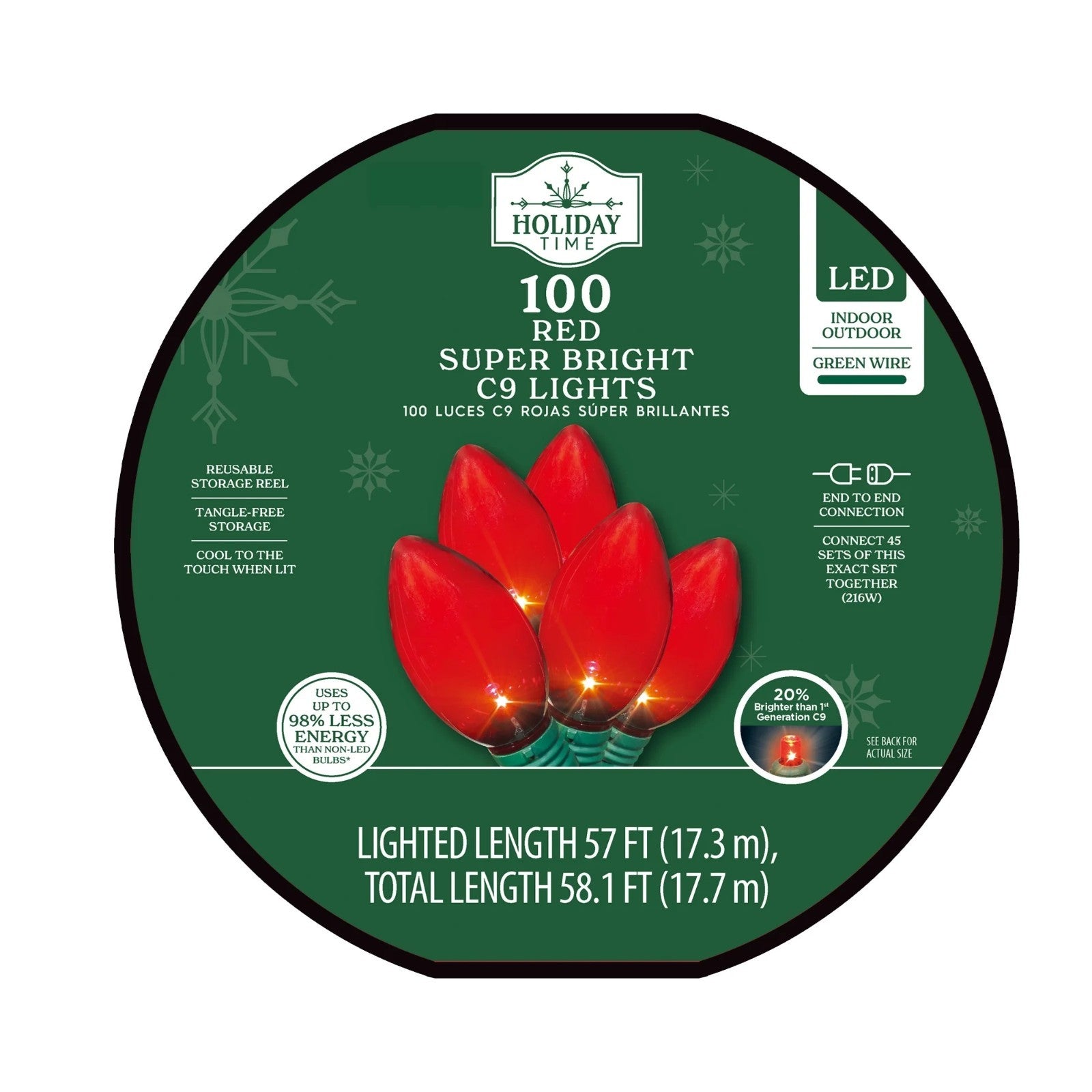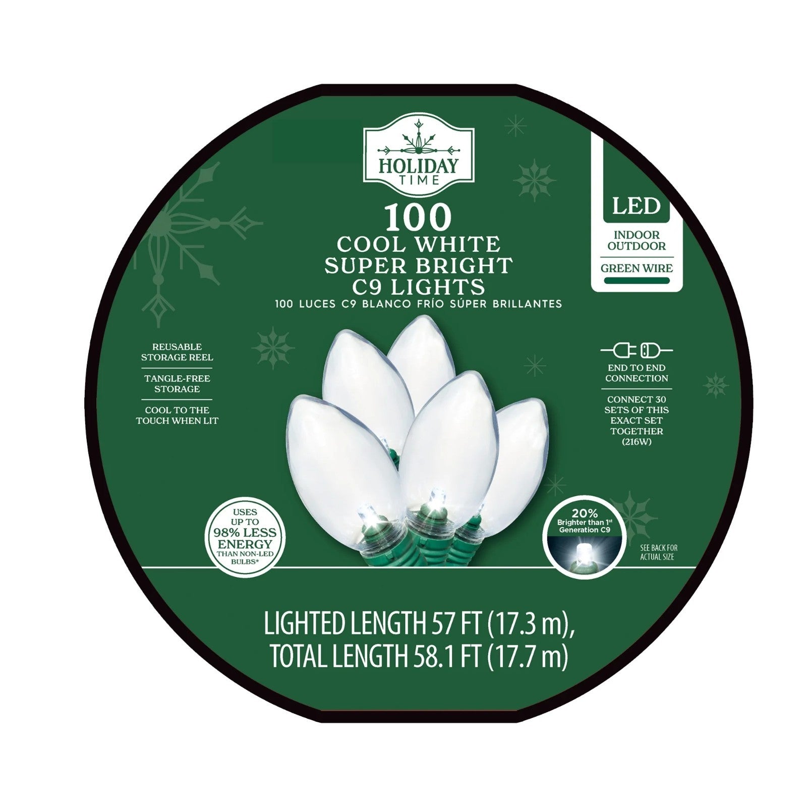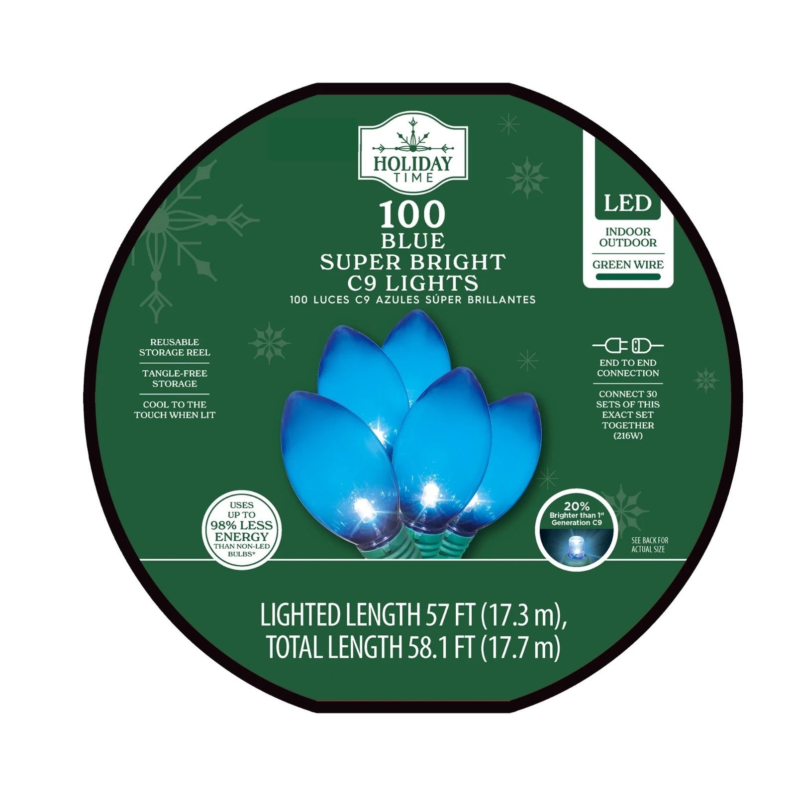 - Holiday Time Indoor/Outdoor 100-Count LED Smooth C9 Christmas Lights, Multicolor, 57'