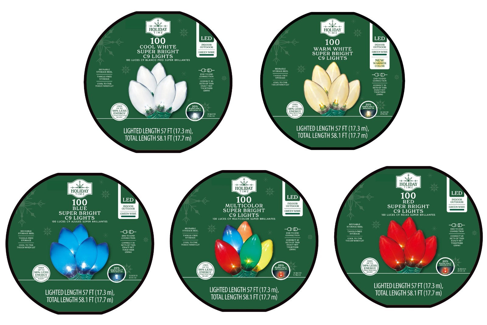 The Holiday Time 100-Count LED Smooth C9 Christmas Lights will bathe your home and holidays in brilliance. This light set features 100 smooth C9 bulbs for a gorgeous sparkling lighting effect across 57 feet inside and outdoors. These LED C9 Christmas lights help save energy and remain cool to the touch even when lit. Connect up to 30 strings of this exact set of lights to create an incredible holiday display sure to delight your family, friends, neighbors, and holiday guests. The Holiday Time Super Bright LED Smooth C9 Christmas Lights are crafted with a green wire in a tangle-free design to blend in perfectly with branches and other greenery. They come in 5 festive colors: Warm White, Cool White, Multicolor, Red, and Blue. The decorating possibilities are endless with the Holiday Time 100-Count LED Smooth C9 Christmas Lights.