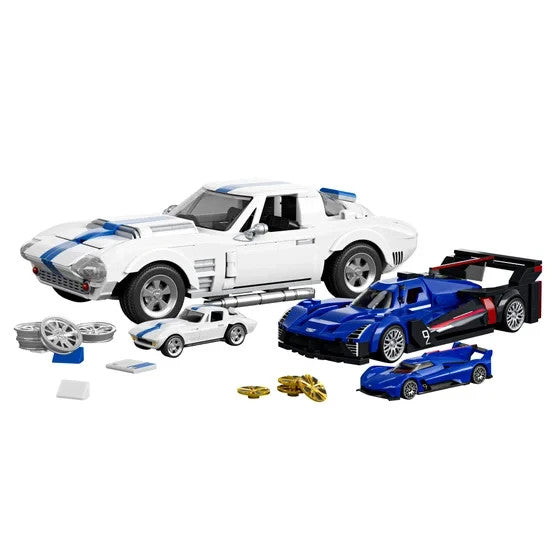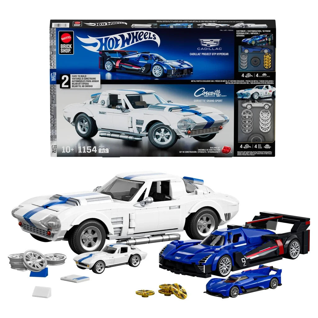 Buckle up for the buildable 1:32 scale Cadillac Project GTP Hypercar and the 1:16 scale Corvette Grand Sport by Mattel Brick Shop. Each car in this set includes decals for customization, 2 sets of wheel covers, a metal signature plate, plus an exclusive matching metal car. Collect more from the Speed Series and Elite Series and build your collection! WARNING! CHOKING HAZARD. Small parts. Not for children under 3 years.