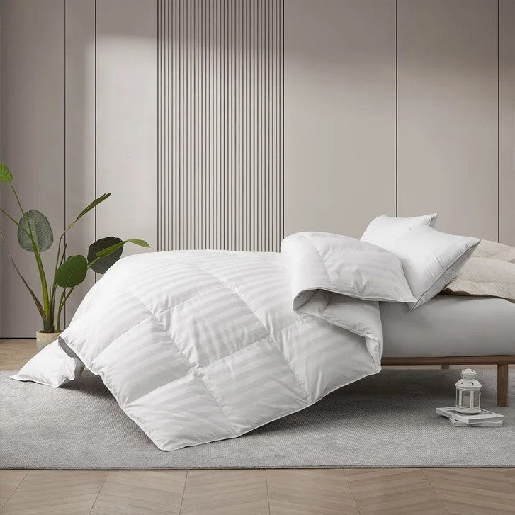 The best insulator nature has to offer: White Down. Enjoy this hotel-quality White Down Comforter with a smooth 500 thread count damask stripe cover, woven from 100% premium cotton. With large down clusters, the filling yields a light- but- warm 650 Fill Power rating to capture body heat, exhibit a fluffy loftiness, and provide excellent, “ just-right” year-round comfort. Exceptional warmth without weight or heaviness!