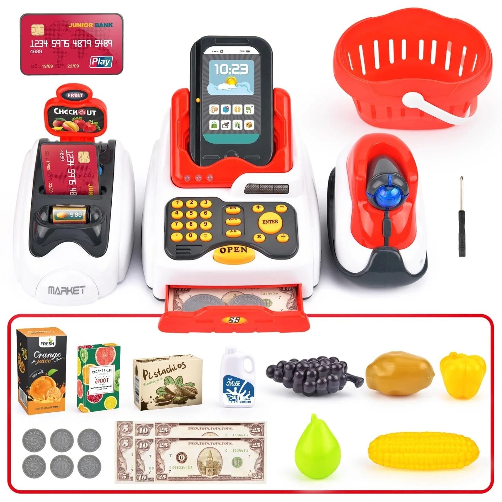 - Comprehensive Accessories: This cash register toy set includes over 20 accessories, such as pretend groceries, coins, bills, and a swipe-able credit card, making playtime immersive and educational.