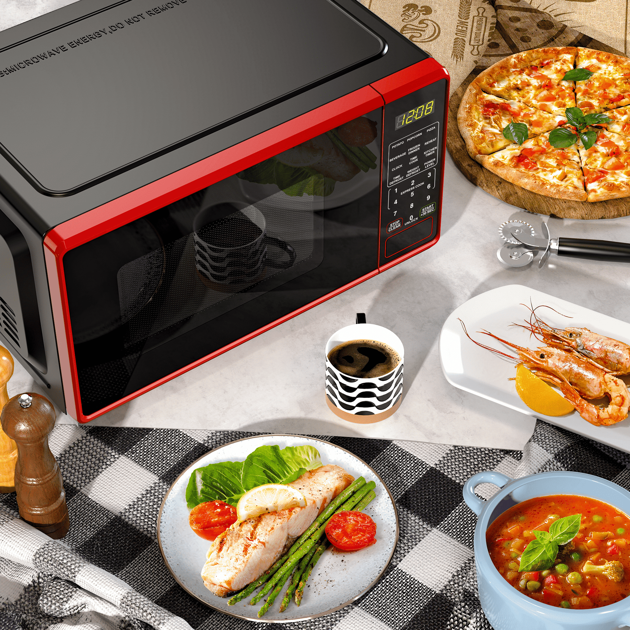 Mainstays 0.7 Cu ft 700-Watt Compact Countertop Microwave Oven is available in 3 colors including Black, Red or White. Each color is designed to complement your kitchen, dorm room, office or rec room. Features include LED display, kitchen timer & clock, 10 different power levels for cooking a variety of foods, weight & time defrost, 6 convenient quick-set menu buttons, 30 second one-touch option, child safety lockout and a push-button door. The Mainstays 0.7 Cu ft 700-Watt Compact Countertop Microwave Oven is the perfect addition to any home. Condition: New, Stock Number: MS8436127995-01