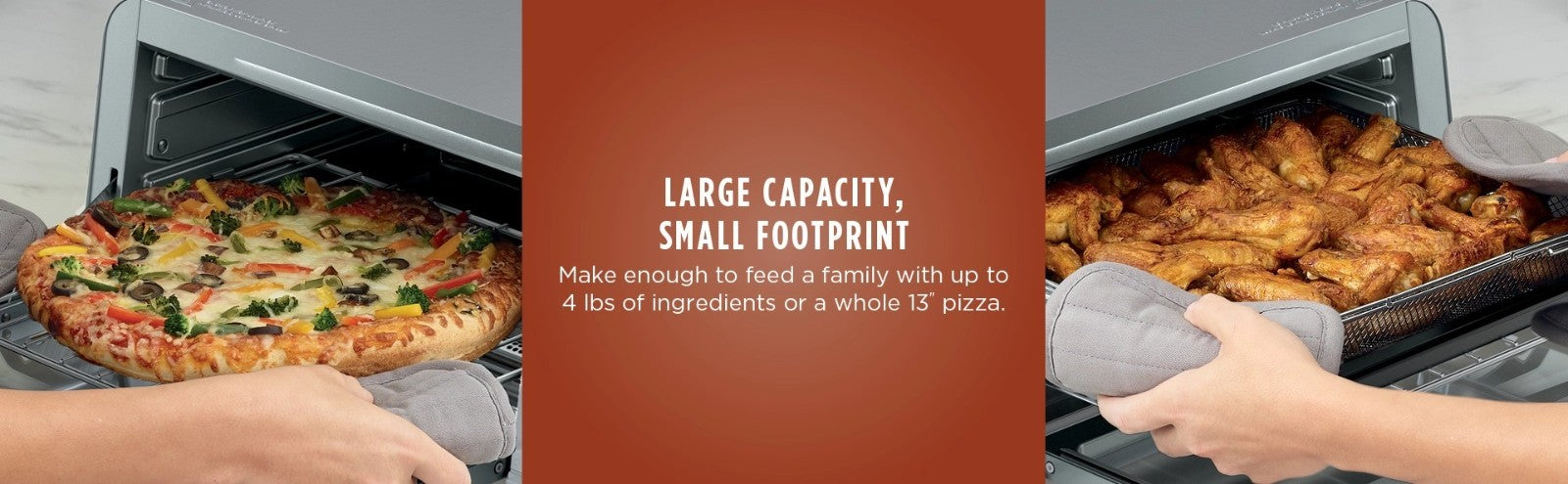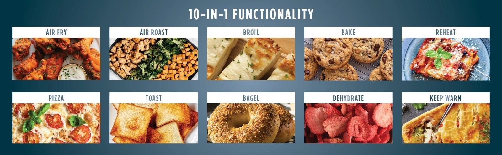 10 Functions: Air fry, Air Roast, Broil, Bake, Pizza, Toast, Bagel, Dehydrate, Reheat, & Keep Warm