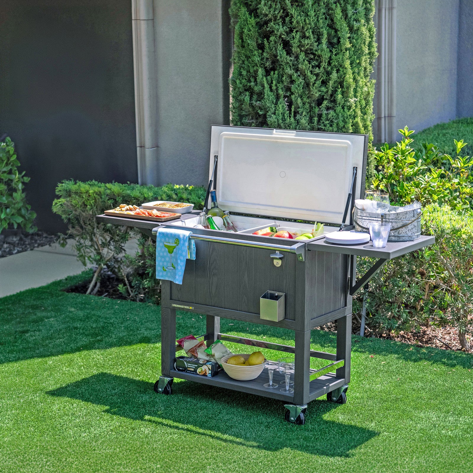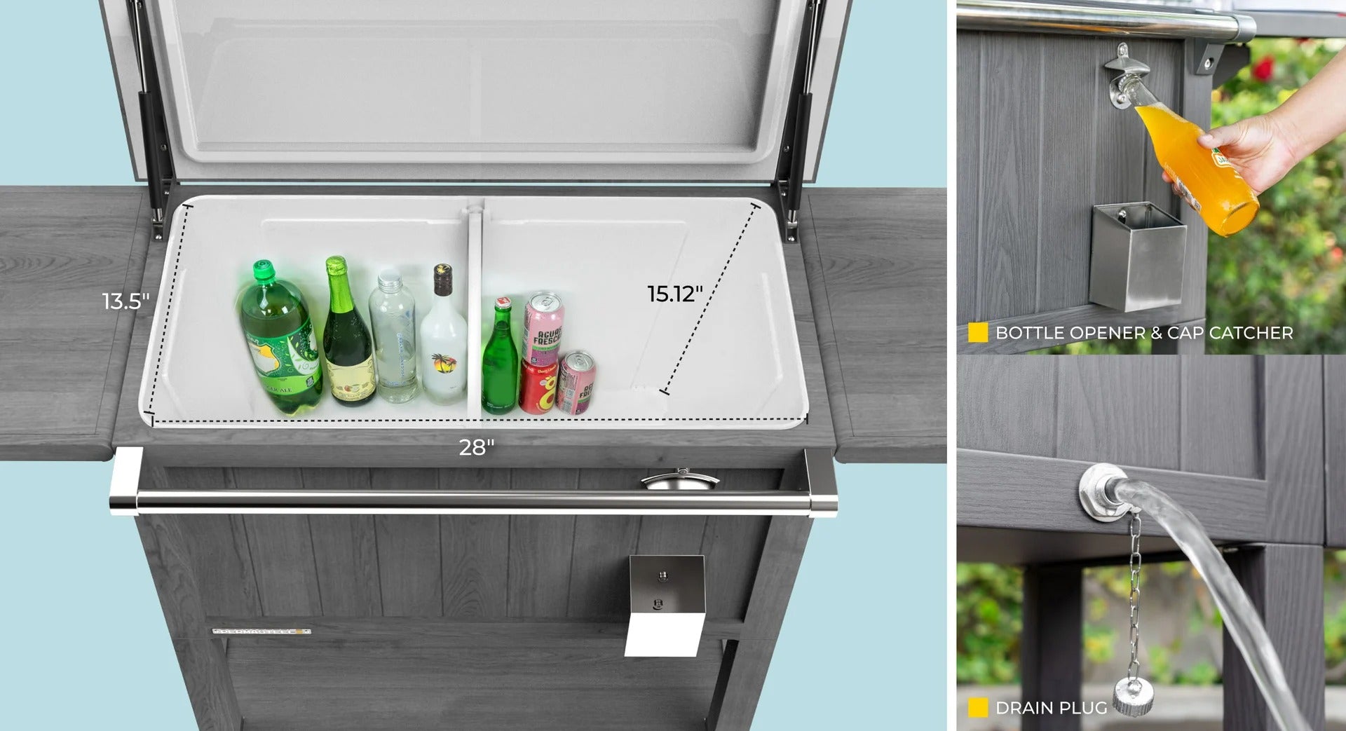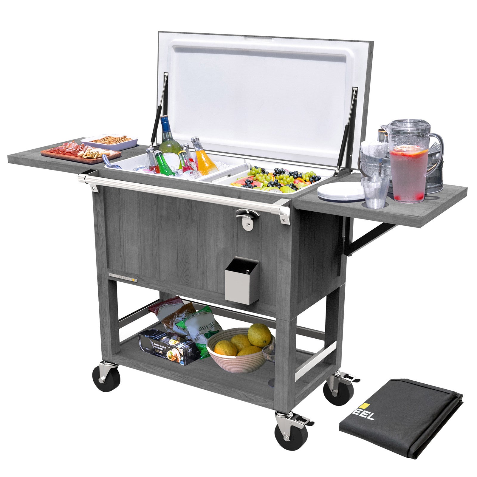 Host the ultimate outdoor party with the Permasteel 100-QT Patio Cooler & Beverage Cart! Crafted from durable, fade-resistant steel, this sleek cooler is designed to withstand the elements while keeping your drinks cold for up to 36 hours, thanks to its premium injected-molded foam insulation. The easy-lift, folding lid provides quick and convenient access, while its stylish design doubles as elegant outdoor furniture, offering extra counter space when not in use. With two fold-up shelves, a removable cooler bin divider that doubles as a tray, and a custom basket to keep food chilled and dry, it’s the ideal companion for any gathering. The lower shelf offers additional storage for drinks, cutlery, or other essentials, making it both functional and fashionable for your next event.
