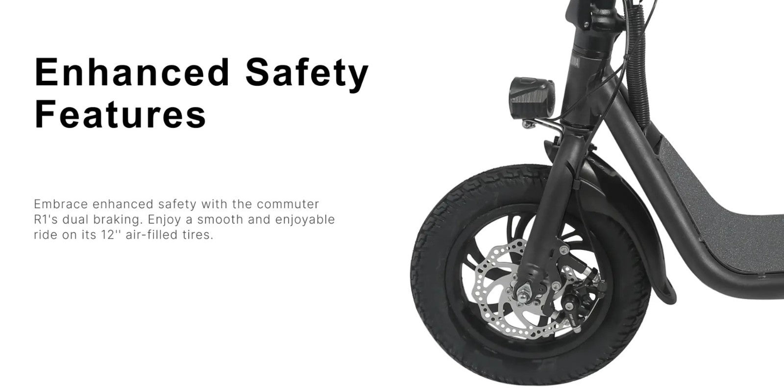 The R1 is our convenient, efficient, and commuter-friendly e-scooter. The R1 is capable of speeds up to 15.5 mph and has an extended range of 20 miles when fully charged. This peppy E-Scooter comes equipped with 12” tires on front and rear, disc brakes, a 450-watt hub motor and 36 volt Li-ion battery. Suitable for ages 12 and older.