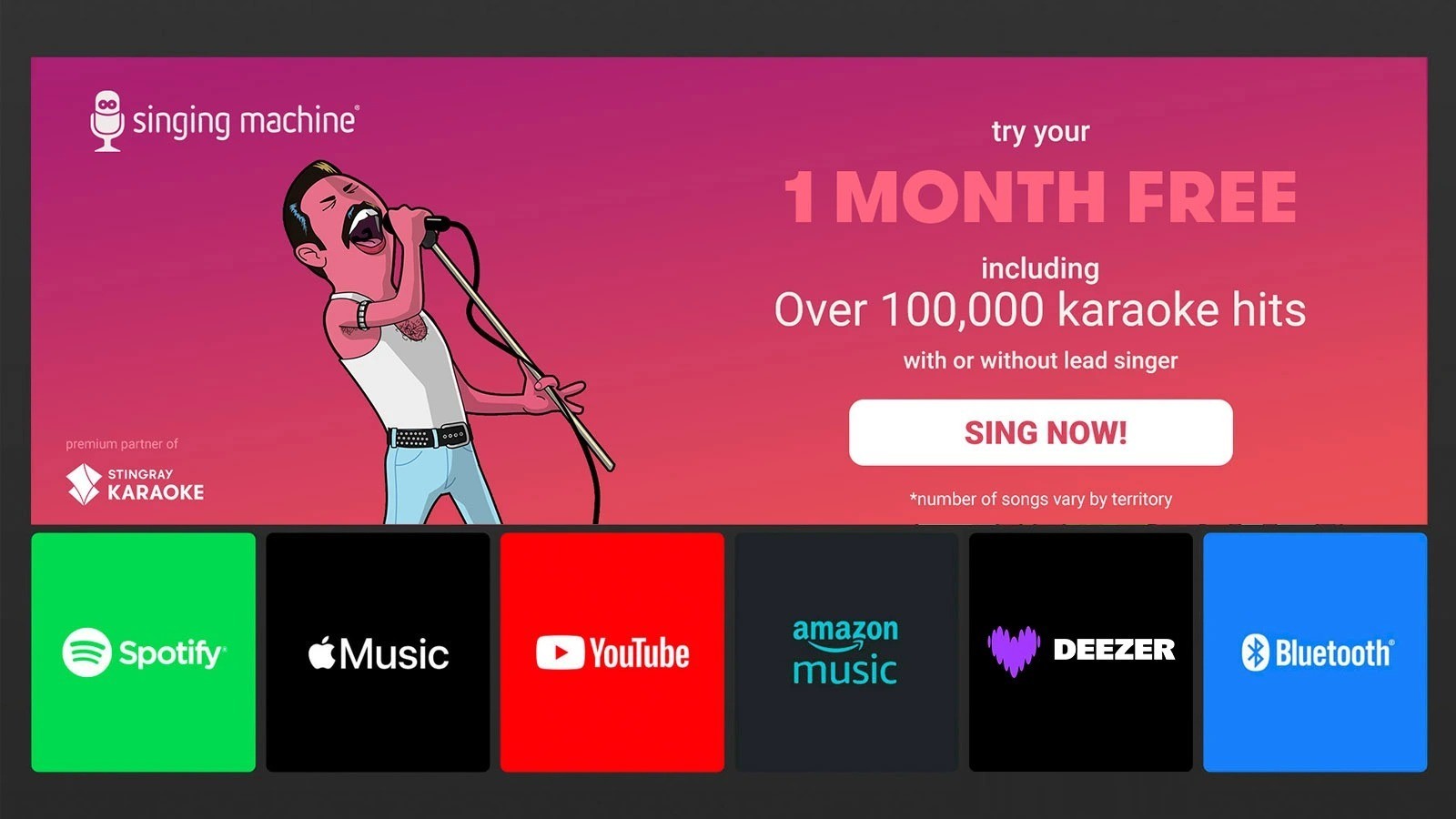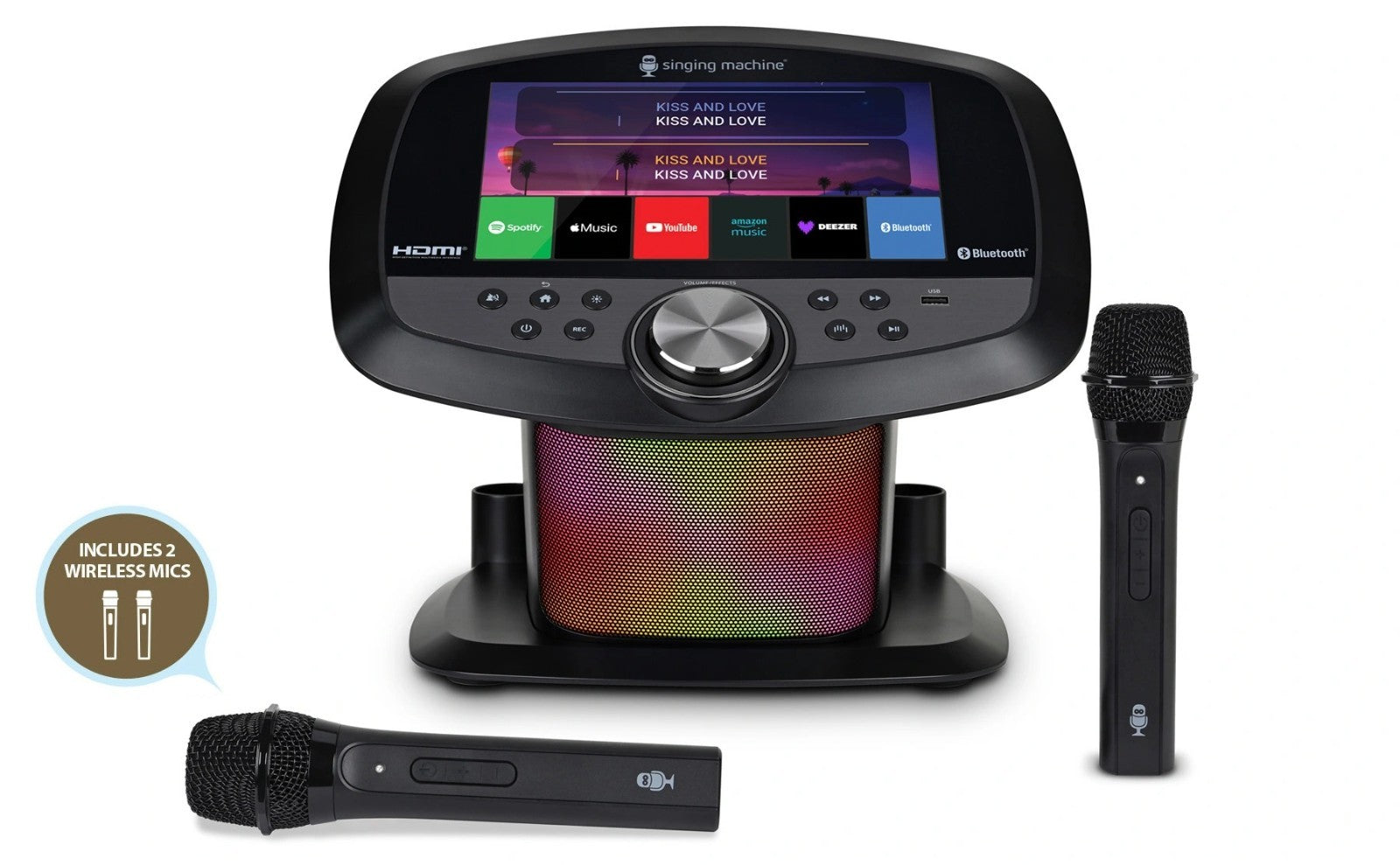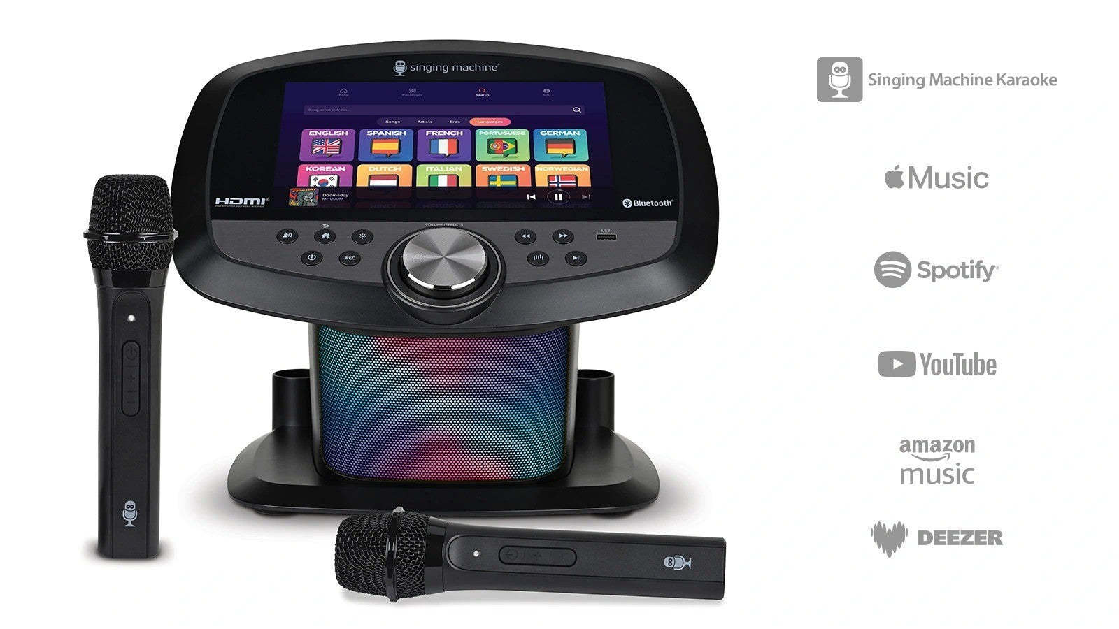 - Built-in Apple Music, Spotify, YouTube, Prime Music, Deezer and Singing Machine Karaoke