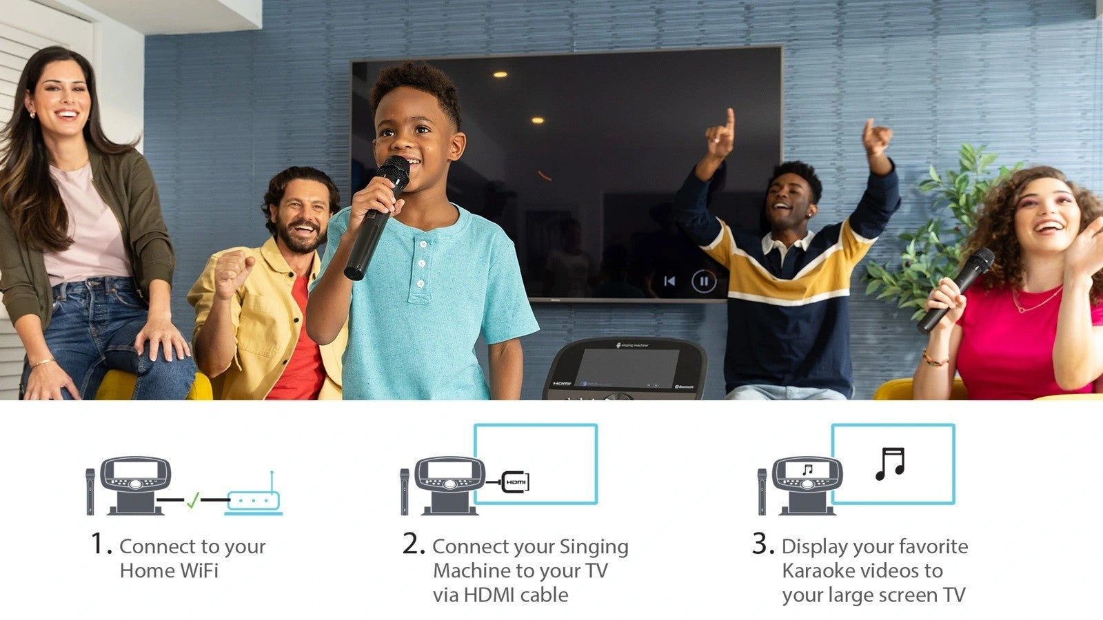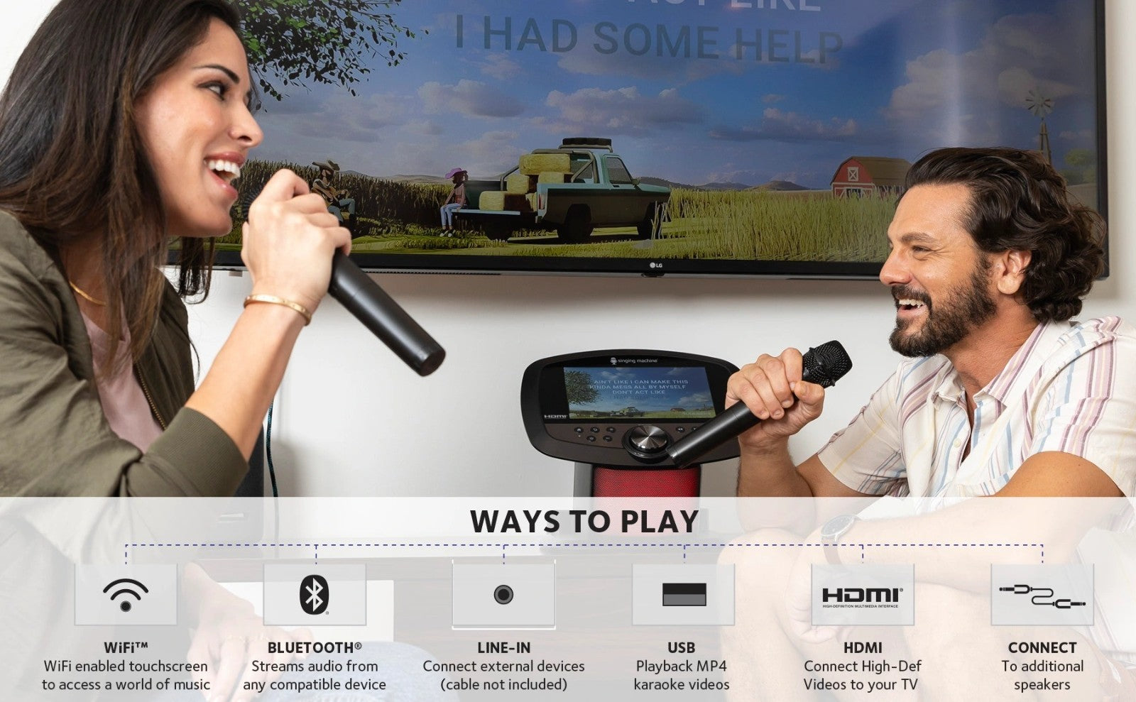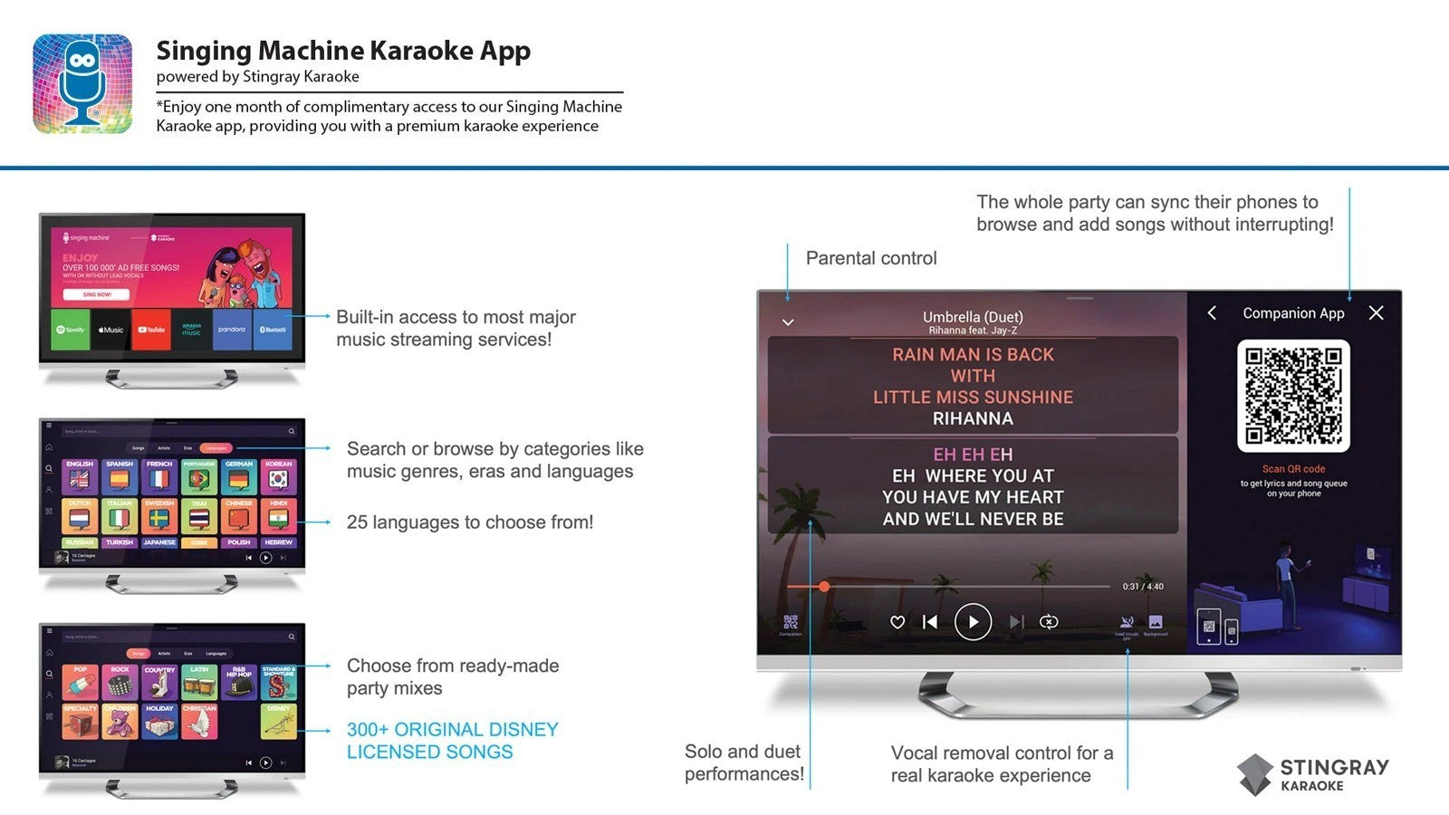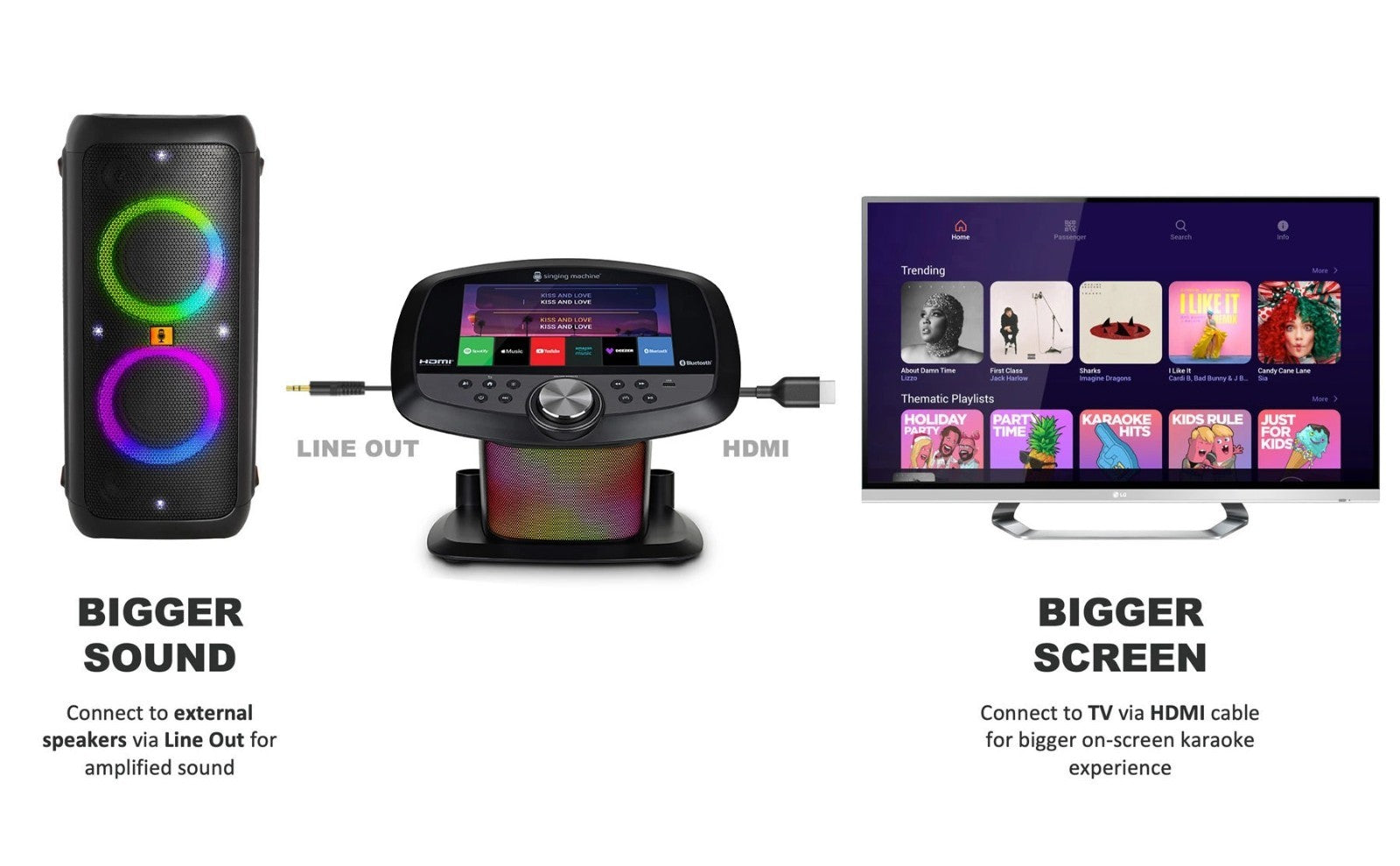 - Built-in Apple Music, Spotify, YouTube, Prime Music, Deezer and Singing Machine Karaoke