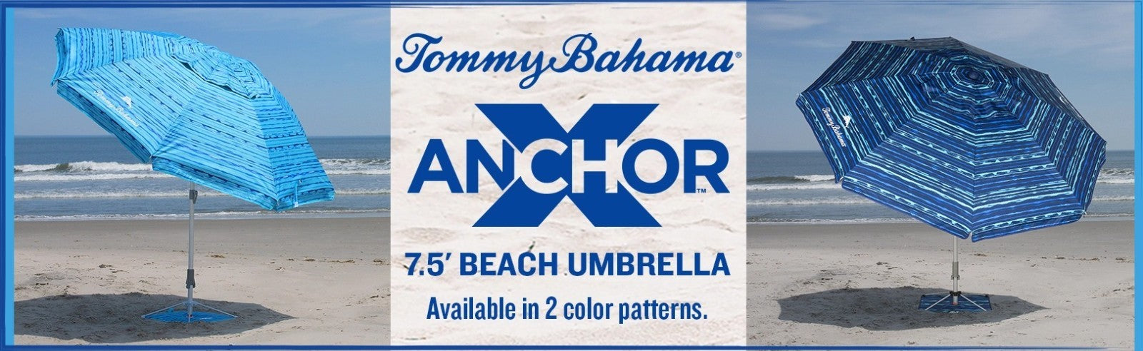 When you need a beach umbrella with style and ultimate durability, add the Tommy Bahama 7.5 ft. Beach Umbrella with patented ANCHORX™ Umbrella System to your list of must-have outdoor accessories. This umbrella features added wind stability with the new ANCHORX™ Umbrella System for windy beach days. The tilt feature offers an adjustable height pole that provides shade adjustments as the sun moves. The umbrella is both durable and gorgeous as a stylish and functional beach accessory for all your outdoor adventures.