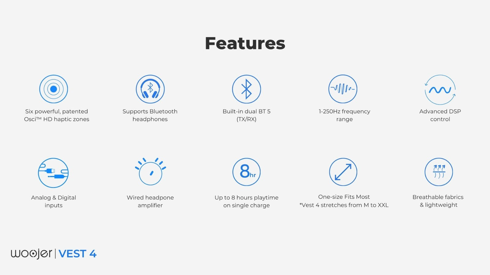 Featuring six advanced Osci™ HD haptic transducers tuned for 1–250 Hz, this vest delivers precise tactile feedback synced perfectly with your audio, music, or gameplay. Whether you’re exploring virtual worlds, playing your favorite FPS, or watching a live concert, Woojer makes every sound unforgettable.